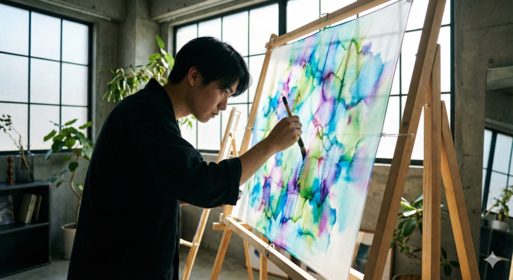 着物の染色技法である「友禅(ゆうぜん)」を使いながら、現代アートのような抽象画を描くスタイルで、今、アートコレクターや目利きの間で静かに話題沸騰中です。