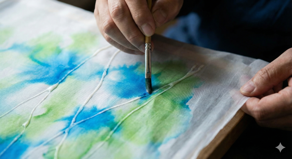 石井さんの作品の最大の特徴は、**「糊防染(のりぼうせん)」**という伝統的な友禅の技法を使っている点です。