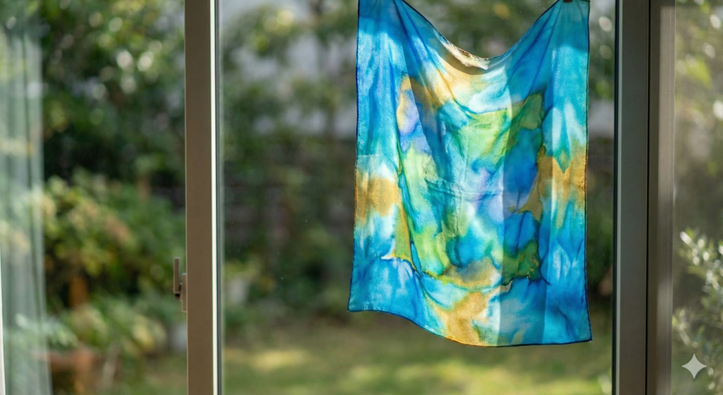 キャンバスに絵の具を乗せる油絵とは違い、布に染料を「染み込ませる」ことで色を表現します。 そのため、作品には独特の**「滲み(にじみ)」や「奥行き」**が生まれます。