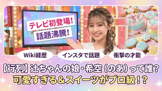 トレンド 【行列】辻ちゃんの娘・希空(のあ)って誰?テレビ初登場で可愛すぎると話題!経歴やブランドについて 2026年1月11日放送の『行列のできる相談所』に出演する、辻ちゃんの娘・希空(のあ)さんについて徹底調査!「可愛すぎる」と話題のWiki経歴や、プロ級と評判のスイーツブランド、インスタ情報まで詳しく紹介します。テレビ初登場の姿は必見です。 トレンド芸能・有名人