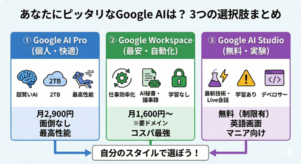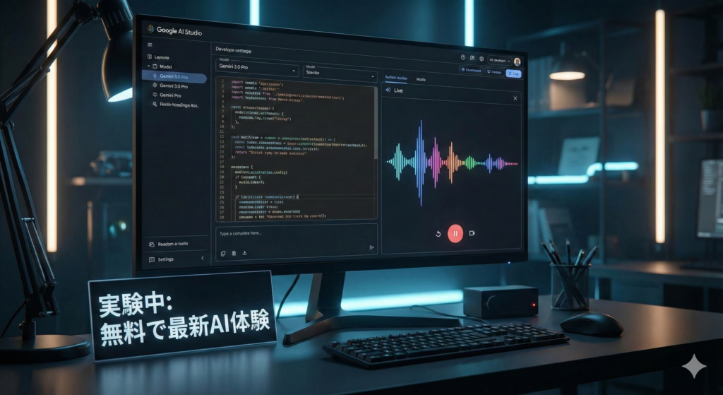 | 無料で実験したい | ③ Google AI Studio | 最新技術をタダで先取り。英語画面に抵抗がない人向け。 |